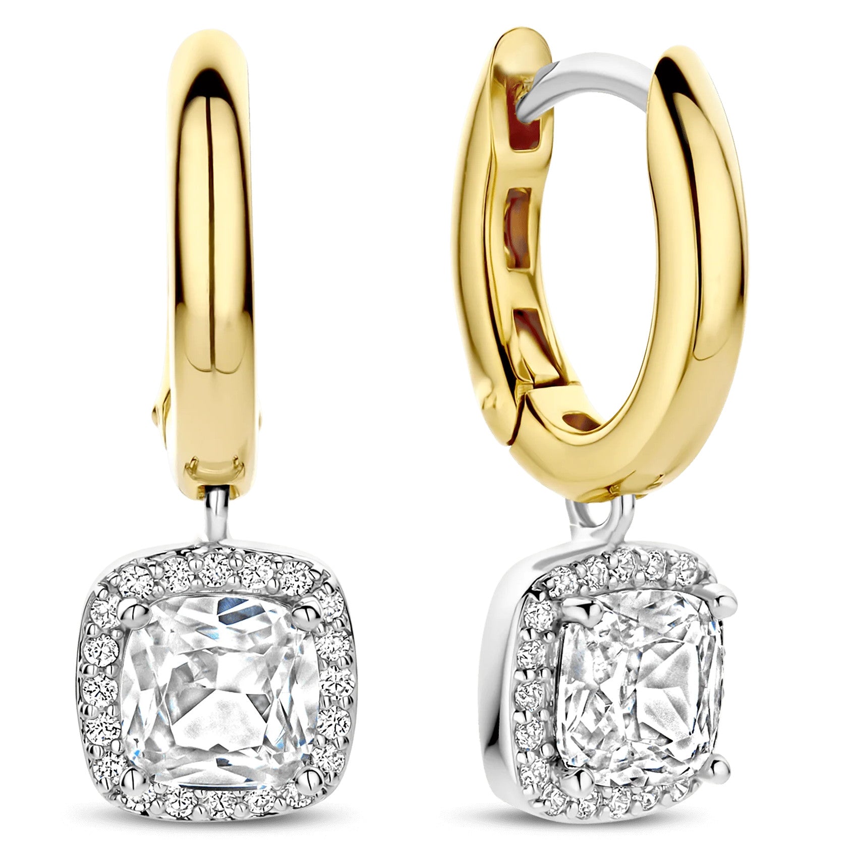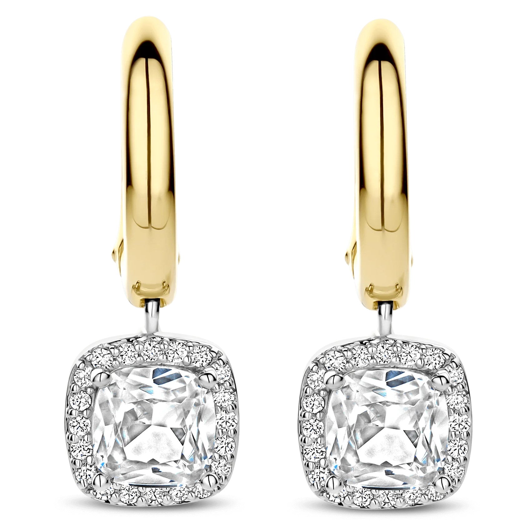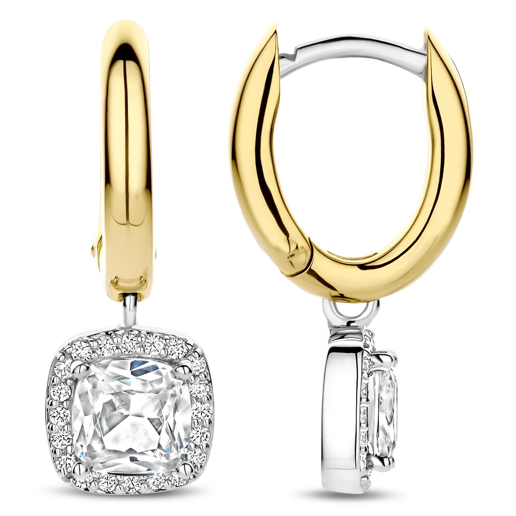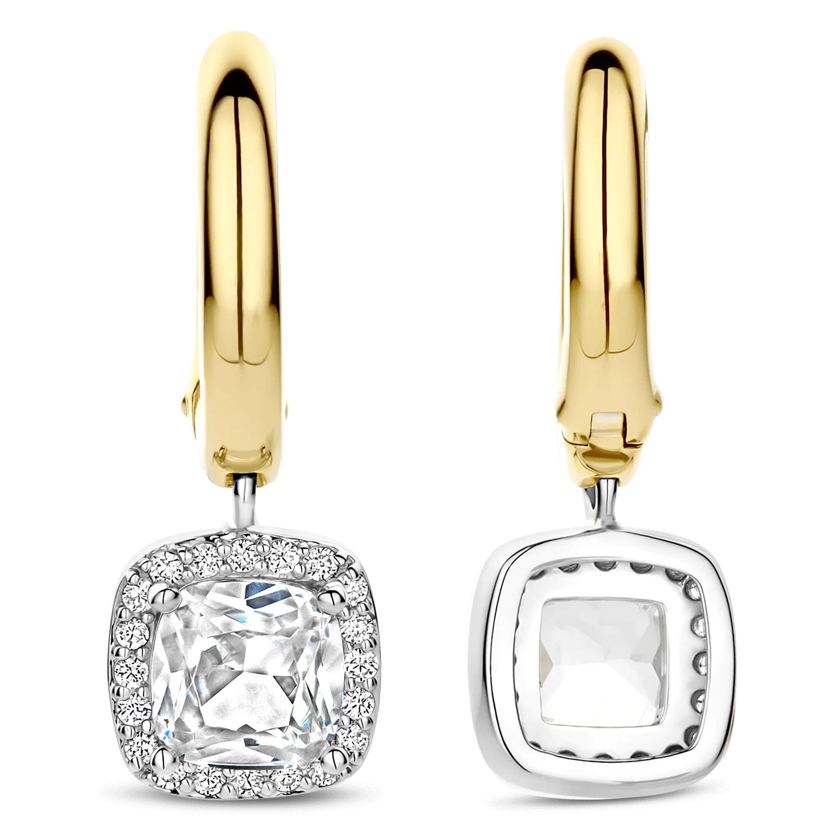 Discover radiant duality with these TI SENTO gold-plated silver Earrings 78030ZY. Crafted from 925 sterling silver, each sleek yellow-golded plated hoop suspends a 7 mm fantasy-cut white cubic zirconia that sways gently beneath the lobe. A fine halo of pavé stones, set in a cool platinum-plated bezel, intensifies the centre stone’s luminosity and adds refined texture as the earrings catch the light. Style the pair solo for effortless day-to-night polish, or layer them with delicate studs to build a curated ear stack. Nickel-free and hypoallergenic, they deliver enduring shine and feather-light comfort.